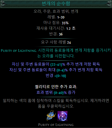 여기서 순수함 오라에 향상보조 젬을 링크하면 4렙 기준 24%의 퀄리티가 올라가 저항 관통은 4%에서 8%로 두배가 됨