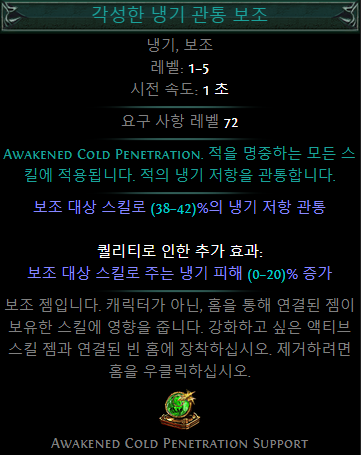 기존에 주 스킬젬에 각성한 냉기 관통보조를 연결해 원소관통을 확보 했지만