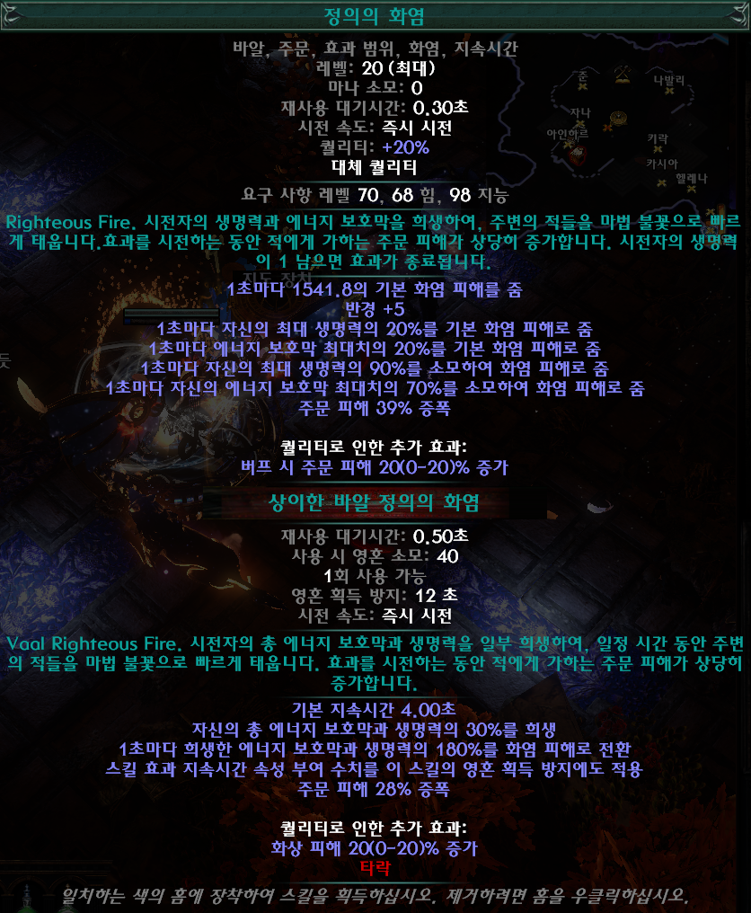 정의의 화염은 1초마다 자신의 생명력과 에너지 보호막에 비례한 피해를 받는 대신 주문 피해 39% 증폭을 얻을 수 있음