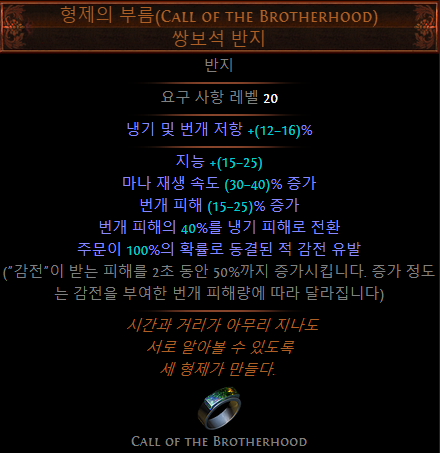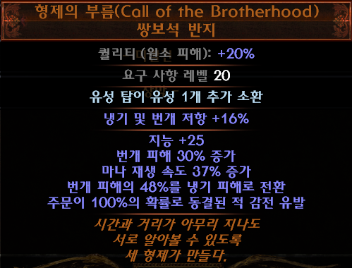 반드시 격동의 기폭제를 발라 퀄리티 20%인 반지를 2개 껴서 번개피해의 96%를 냉기피해로 전환 시켜야 함