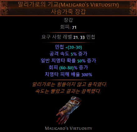 치명타 피해 배율을 챙기기 어렵기 때문에 말리가로의 기교 장갑을 사용함