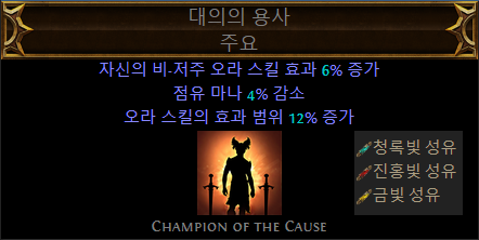 오라 효과 증가 커럽옵 또는 공격 및 주문 시전시 플랫딜을 챙기면 됨(POB에서 딜 증가 확인 필수)
